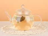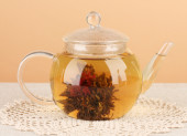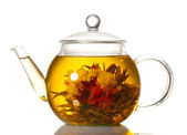 egzotyczne zielonej herbaty z kwiatami w szklany czajnik na stole na kolor background.process co herbata