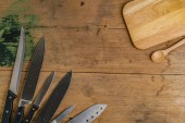 stary pusty brązowy prostokątne drewnianą deską do krojenia i nóż, widok z góry