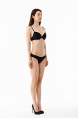 Piękna kobieta lengh wypełnienia w czarny bielizny Studio z szarym tłem. Nie obiektu.