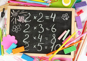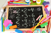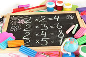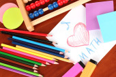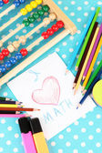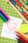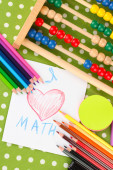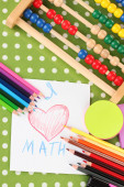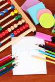 zabawka abacus, notatka papier, ołówki, na jasnym tle