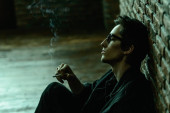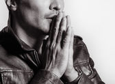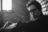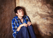 Portret młodego mężczyzny smutny, zamyślony. Strych styl wnętrza. Uroda męska.