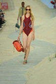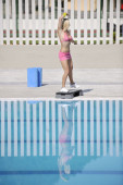 Atrakcyjny i sportowy strój kąpielowy model siedzi ratownik wieża.