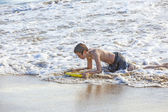 szczęśliwy młody chłopak jest kopanie w piasku na plaży i konstruowanie