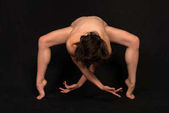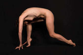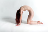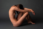 Wysokości smukłe ukraiński brunetka siedząc nago na szarym tle
