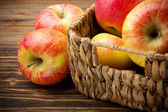 Dojrzałe jabłka czerwone i zielone jabłko na podłoże drewniane.