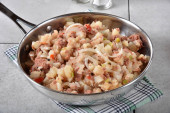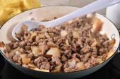 Widokiem z góry rumiane gorund wołowiny i cebuli na patelni