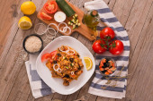 Nasi goreng na drewnianym stole.