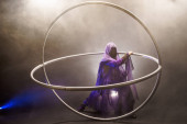 Zabójca. Baśniowy charakter w jasny fioletowy garnitur z kapturem i niezwykłą broń.