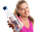 Młoda atrakcyjna kobieta uśmiechając się i prezentowania butelkę wody i uśmiechający się jako witalność zdrowy hydratacji koncepcja na białym tle