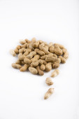 Orzeszki ziemne na brązowym tle obrazów. Kupie orzeszków ziemnych z skrócie. Prażone orzeszki ziemne z bliska na brązowym tle