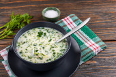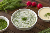 Okroshka, zimne lato zupa z świeżych warzyw, mięsa i jogurt.