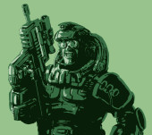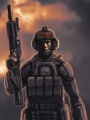 Żołnierz przyszłości z dużych karabin. Bitwa na obcej planecie. Pomarańczowe tło.