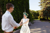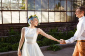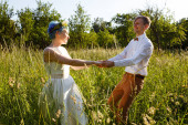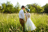 Zdjęcie "Para młoda ślub posiadają romantyczne chwile poza na letnia łąka. Dziewczyna ma niebieskie włosy." może być wykorzystywane do celów osobistych i komercyjnych zgodnie z warunkami zakupionej licencji Royalty-free. Obraz jest dostępny do pobrania w jakości wysokiej rozdzielczości do 5760x3840.