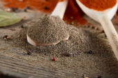 Zdjęcie "Widok z góry z drewniane łyżki pełne paprica i czarny pieprz na podłoże drewniane beczki, Selektywny fokus." może być wykorzystywane do celów osobistych i komercyjnych zgodnie z warunkami zakupionej licencji Royalty-free. Obraz jest dostępny do pobrania w jakości wysokiej rozdzielczości do 5760x3840.
