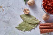 Trzy miski szklane z przyprawami są ułożone w rzędach na białym tle teksturowane, zobacz z góry.