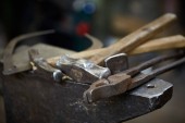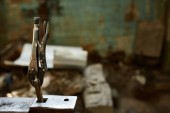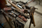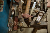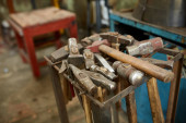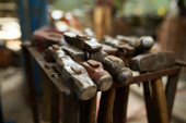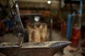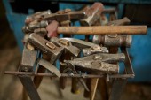 Metalowe narzędzia w warsztacie kowali, zbliżenie, Selektywny fokus, pracy nikt nie