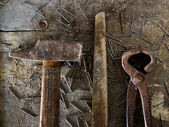 Metalowe narzędzia w warsztacie kowali, zbliżenie, Selektywny fokus, pracy nikt nie