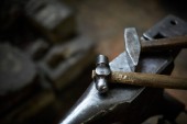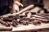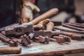 Metalowe narzędzia w warsztacie kowali, zbliżenie, Selektywny fokus, pracy nikt nie