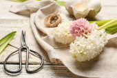 Narzędzia ogrodowe z drewniany wózek pełne kwiatów Cosmos
