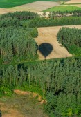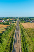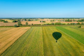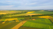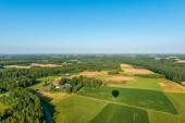 Pola uprawne i łąki na Mazowszu, bezchmurne jasne niebo. Poniżej można zobaczyć niektóre pola zniszczone przez deszcz
