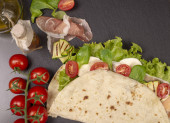 Włoski piadina romagnola Podpłomyk z sałata, pomidory, szynka prosciutto, ser mozzarella i grillowaną cukinią
