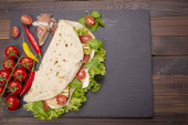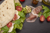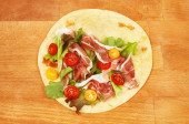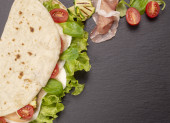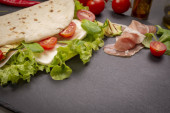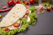 Włoski piadina romagnola Podpłomyk z sałata, pomidory, szynka prosciutto, ser mozzarella i grillowaną cukinią