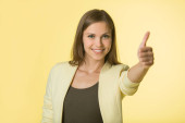 piękna młoda dziewczyna w żółtą kurtkę i noszenie okularów na żółtym tle