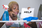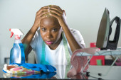 Zdjęcie "młody piękny sad i zdesperowany czarny African American kobieta uczucie podkreślił, sfrustrowany praca w domu kuchnia z domowych pracy stres w koncepcji zmęczony i przepracowany gospodyni" może być wykorzystywane do celów osobistych i komercyjnych zgodnie z warunkami zakupionej licencji Royalty-free. Obraz jest dostępny do pobrania w jakości wysokiej rozdzielczości do 5760x3840.