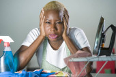 Zdjęcie "młody piękny smutny i zdesperowany czarny afro American kobieta podkreślił pracę sfrustrowany w domu kuchnia uczucie prace domowe stres w koncepcji zmęczony i przepracowany gospodyni" może być wykorzystywane do celów osobistych i komercyjnych zgodnie z warunkami zakupionej licencji Royalty-free. Obraz jest dostępny do pobrania w jakości wysokiej rozdzielczości do 5760x3840.