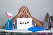 młody piękny smutny i zdesperowany czarny afro American kobieta podkreślił pracę sfrustrowany w domu kuchnia uczucie prace domowe stres w koncepcji zmęczony i przepracowany gospodyni
