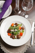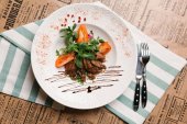 Rolle mięsne, podawane z świeżą rukolą i pomidorami na białym talerzu