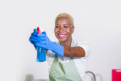 młody atrakcyjny i szczęśliwy czarne african american kobieta sprzątanie domu kuchnia gospodarstwa detergentu spray butelki noszenie prania Rękawiczki gumowe uśmiechający się wesoły w krajowych sprzątanie