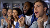 Wielorasowe przyjaciółmi siedząc na kanapie i komfortowo oglądać wydarzenia sportowe na tv