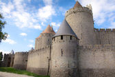 Mury twierdzy średniowiecznego miasta Carcassonne we Francji latem