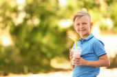 Mały chłopiec z szklanki mleka wstrząsnąć na zewnątrz