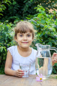 Mała dziewczynka wylewanie naturalne lemoniadę do kubka na stoisku w parku