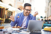 Zdjęcie "Biznesmen o śniadanie i jego pracy w kawiarni." może być wykorzystywane do celów osobistych i komercyjnych zgodnie z warunkami zakupionej licencji Royalty-free. Obraz jest dostępny do pobrania w jakości wysokiej rozdzielczości do 5760x3840.