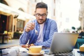 Biznesmen o śniadanie i jego pracy w kawiarni.