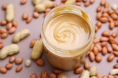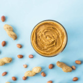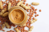 Słoik masła orzechowego kremowy, widok z góry. Szczelnie-do góry.