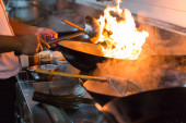 Kucharz jest warzywa podsmażyć z przyprawami i sosem w woku na płomień. Proces gotowania w restauracja Azjatycka.