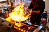 Zdjęcie "Kucharz jest warzywa podsmażyć z przyprawami i sosem w woku na płomień. Proces gotowania w restauracja Azjatycka." może być wykorzystywane do celów osobistych i komercyjnych zgodnie z warunkami zakupionej licencji Royalty-free. Obraz jest dostępny do pobrania w jakości wysokiej rozdzielczości do 5760x3840.