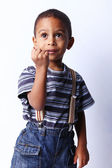 Zaskoczony Ładna uczniak z brązowe, kręcone włosy, ubrany w niebieską koszulę, pozowanie na Studio. Na ciemnym tle z teksturą tle.