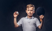 Szczęśliwy uczniak z brązowe, kręcone włosy, ubrany w niebieską koszulę posiada piłki tenisowe, zabawy w studio. Na ciemnym tle z teksturą tle.