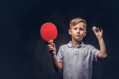 Zdjęcie "Szczęśliwy uczniak z brązowe, kręcone włosy, ubrany w niebieską koszulę posiada piłki tenisowe, zabawy w studio. Na ciemnym tle z teksturą tle." może być wykorzystywane do celów osobistych i komercyjnych zgodnie z warunkami zakupionej licencji Royalty-free. Obraz jest dostępny do pobrania w jakości wysokiej rozdzielczości do 5760x3840.