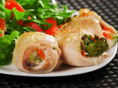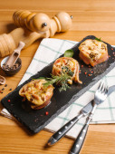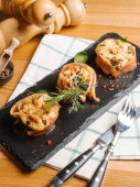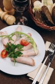 Boczek świeże bułeczki podawane z rukola Sałatka na białym talerzu