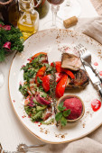 Boczek świeże bułeczki podawane z rukola Sałatka na białym talerzu
