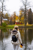 Szczupła kobieta z plecakiem przemieszcza się na wysokiej trawy.
