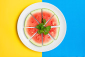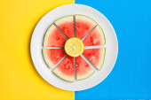 Zdjęcie "Arbuz na płycie z Limonka cytryna i mięta pozostawia na tle kolor split." może być wykorzystywane do celów osobistych i komercyjnych zgodnie z warunkami zakupionej licencji Royalty-free. Obraz jest dostępny do pobrania w jakości wysokiej rozdzielczości do 5760x3840.