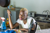 Zdjęcie "portret młodego zmarnowane i pijany alkoholowych czarny afro American gospodyni picia butelka alkoholu w domu kuchnia uczucie zdesperowany i smutny problem nadużywania i uzależnienia od alkoholu" może być wykorzystywane do celów osobistych i komercyjnych zgodnie z warunkami zakupionej licencji Royalty-free. Obraz jest dostępny do pobrania w jakości wysokiej rozdzielczości do 5760x3840.