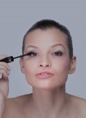 Kobieta z zastosowaniem suchej kosmetyk fundamentu tonalnych na twarzy za pomocą m